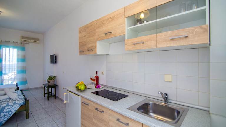 Die Zimmer bieten ein angenehmes Raumklima mit Klimaanlage und Heizung. Sie verfügen über eine Terrasse oder einen Balkon mit Meerblick, ein Doppelbett oder ein Sofabett, eine Kochnische, einen Kühlschrank sowie ein eigenes Badezimmer. WLAN ist ebenfalls verfügbar.