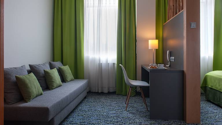 Die Zimmer sind mit Klimaanlage, Heizung und einem möblierten Balkon oder Terrasse ausgestattet. Sie verfügen über ein Kingsizebett, ein Sofabett, Safe, Schreibtisch sowie eine Kochnische mit Kühlschrank und Tee-/Kaffeekocher. Die Badezimmer sind mit Dusche und Badewanne ausgestattet. Zu den Annehmlichkeiten gehören auch Hausschuhe, TV, WiFi (ohne Gebühr) und Tageszeitungen.