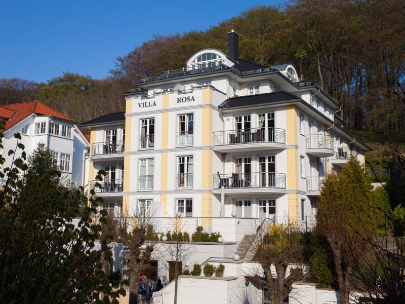 Majestätisch thront die 2012 eröffnete Villa Rosa inmitten prächtiger Bäderarchitektur direkt an Sellins Wilhelmstraße, einer der beliebtesten Flaniermeilen Rügens. Nur ein paar Schritte sind es von hier – vorbei an kleinen Boutiquen, Eiscafés und erstklassigen Restaurants – bis zum Hauptstrand mit der Seebrücke oder hinüber in den nahe gelegenen Kurpark mit dem Friedensberg, einem mystischen Ort der Einkehr, Ruhe und Erholung. In der Villa Rosa begrüßt Sie die Wohnung Nr. 11 "Bellevue" mit drei sehr geschmackvoll und hochwertig eingerichteten Zimmern und zwei Balkonen zu einem wahren Traumurlaub auf der Insel Rügen. Die Räumlichkeiten sind angenehm lichtdurchflutet und bieten allen Komfort, den man sich in seinem Urlaub wünschen kann. Und die kleinen Gäste wird es ganz besonders freuen, dass es im Garten hinter dem Haus sogar einen extra Spielbereich gibt. Das Appartementhaus Villa Rosa offeriert seinen Gästen aber noch viel mehr: Im hauseigenen Wellnessbereich mit finnischer Sauna, Dampfbad und Ruhezone genießen Sie ganz entspannt Ihre persönliche Auszeit vom Alltag. Auch um einen Parkplatz müssen Sie sich keine Gedanken machen – in der Tiefgarage sind Ihr Auto und Ihre Räder bestens aufgehoben.
