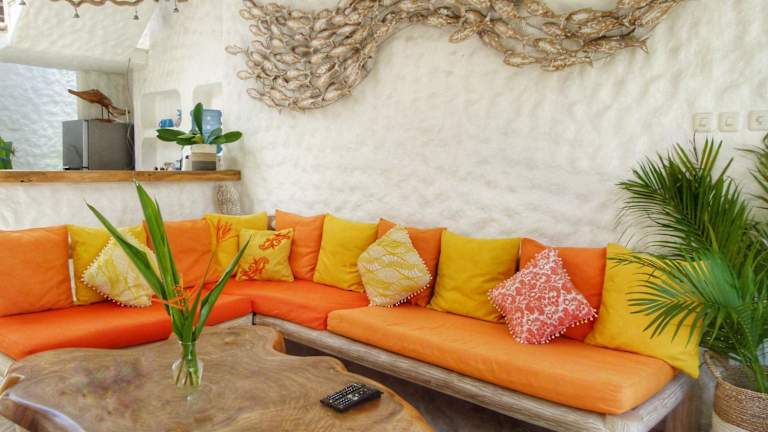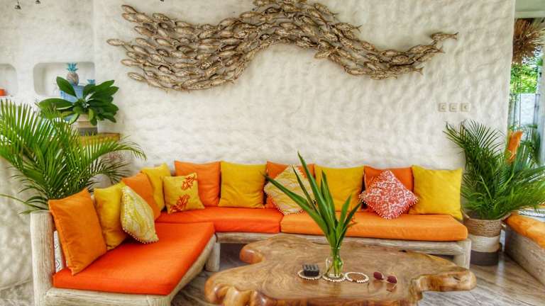 Die Villa Rustic Charm bietet eine gemütliche und komfortable Unterkunft. Die strohgedeckte Villa verfügt über einen offenen Sitzbereich mit bequemen Sofas und eine voll ausgestattete Küche, in der Sie Ihre eigenen Mahlzeiten zubereiten können. Das Zimmer ist mit einem Kleiderständer, einem Safe und Moskitonetzen ausgestattet, um einen angenehmen Aufenthalt zu gewährleisten. Das eigene Badezimmer ist halb im Freien und verfügt über eine Badewanne oder Dusche, einen Haartrockner und kostenfreie Pflegeprodukte.
