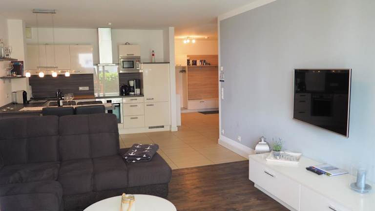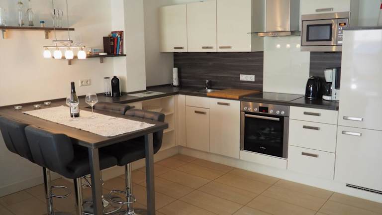 Die Ferienwohnung umfasst ein Schlafzimmer, ein Badezimmer mit Dusche, ein Wohnzimmer, einen Essbereich sowie eine voll ausgestattete Küche mit Kühlschrank, Geschirrspüler und Ofen. Ein Blu-ray-Player steht zur Verfügung. Handtücher und Bettwäsche können gegen Aufpreis ausgeliehen werden; diese müssen vor der Ankunft gebucht werden.