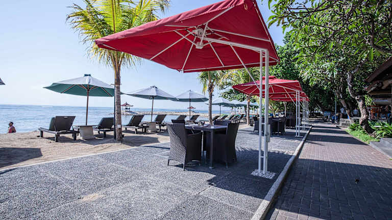 Das Hotel befindet sich in Sanur, direkt am Sandstrand und inmitten eines kleinen, tropischen Gartens. Die Promenade verläuft parallel zum Strand und bietet zahlreiche Möglichkeiten für gemütliche Bummel. Kuta ist ca. 14 km entfernt, und Denpasar erreicht man in etwa 7 km. Der Flughafen Ngurah Rai International Airport liegt in einer Distanz von ca. 15 km und die Transferzeit beträgt ungefähr 40 Minuten.