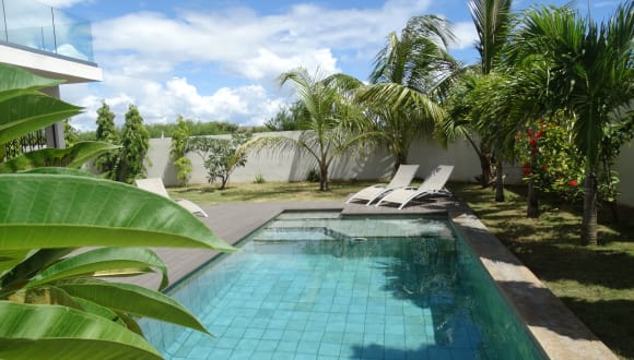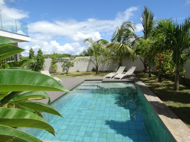 Ideally located, 3 minutes walk from a paradisiacal beach, this new and completely secured villa is the perfect place for a convivial holiday as a couple, with family or friends. With its modern fully equipped kitchen, dining room, living room with TV (satellite channels), 4 spacious bedrooms, all air-conditioned, 3 bathrooms equipped with showers and large walk-in wardrobes you will have all the comfort for an unforgetable stay. Enjoy your breakfast or dinner from the patio with view on the private pool. And why not prepare a good BBQ in the large exotic garden with banana trees, coconut trees, palm trees, frangipani ... WIFI throughout the house. Common gym available. Friendly and helpful staff, reflecting the warm character of the Mauritians. The presence of a guest relation forms the small plus of the house.