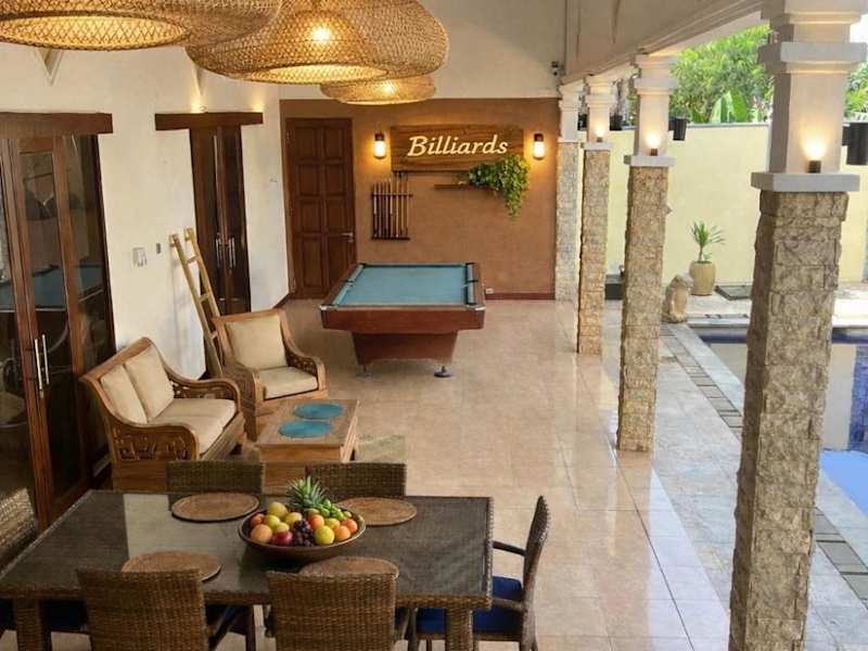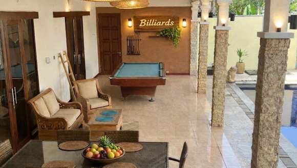 Die Villa Stella Garden ist eine wunderschöne freistehende Villa in der Region Senggigi auf der Insel Lombok. Mit ihrer abgeschiedenen Lage und dem großen Garten bietet sie den perfekten Ort für Entspannung und Erholung. Der große Pool und das Kinderbecken sorgen für Spaß und Abkühlung an heißen Tagen. Die Villa ist komplett ausgestattet und verfügt über ein gemütliches Wohnzimmer mit Sat-TV sowie eine moderne Küchenzeile. Kostenlose WLAN-Nutzung ist in der gesamten Unterkunft möglich. Ein besonderes Highlight ist die Terrasse, auf der Sie eine Runde Billard spielen können. Handtücher und Bettwäsche werden zur Verfügung gestellt und ein Babybett und ein Hochstuhl sind ebenfalls vorhanden. Der internationale Flughafen Lombok ist nur 37 km entfernt, so dass Sie Ihre Reise bequem fortsetzen können.