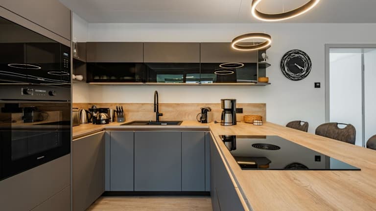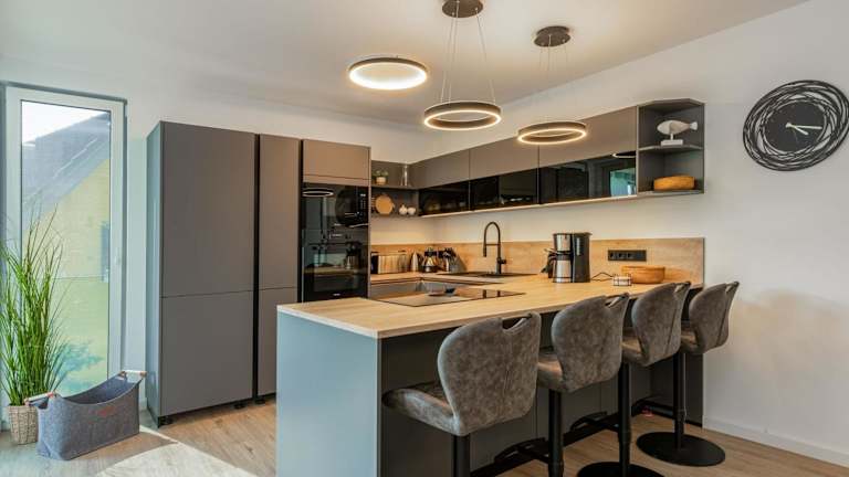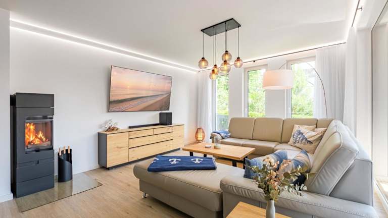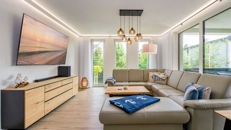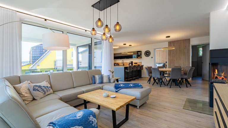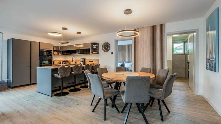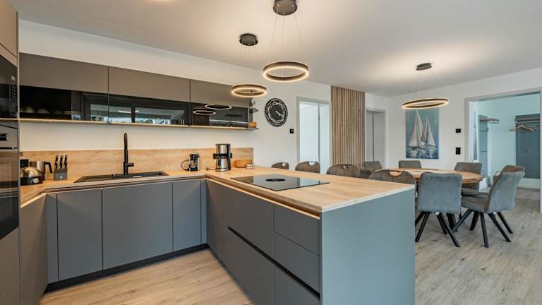 Die Ferienwohnung umfasst vier Schlafzimmer, ein Wohnzimmer, eine voll ausgestattete Küchenzeile mit Kühlschrank und Kaffeemaschine sowie vier Badezimmer, die jeweils mit einer Dusche und einem Haartrockner ausgestattet sind. Zur Unterhaltung steht ein Flachbild-TV zur Verfügung.