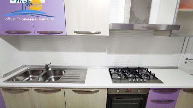 Die Villa sulla Spiaggia Diamante bietet eine heimelige Unterkunft mit eigenem Strandbereich, Garten und Terrasse. Die Villa ist klimatisiert und eignet sich für verschiedene Ferienaktivitäten.