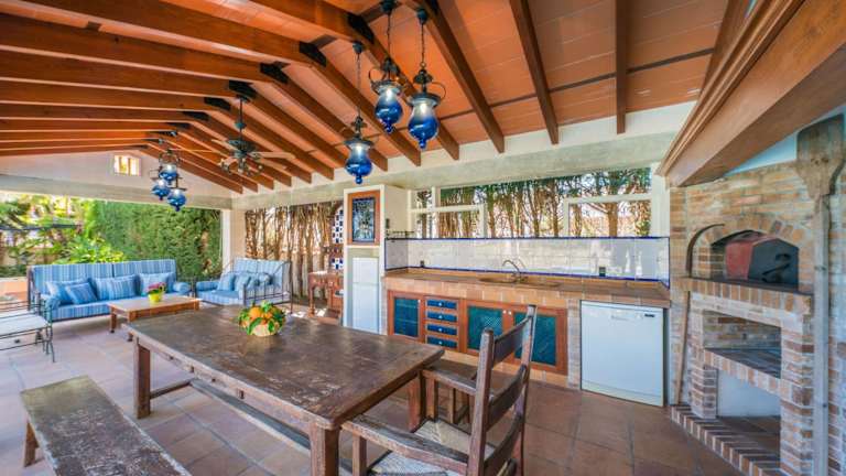 Die Küche der Villa ist ausgestattet mit einem Kühlschrank, Geschirrspüler, Ofen, Kaffeemaschine und Wasserkocher, was die Zubereitung eigener Mahlzeiten ermöglicht. Grillmöglichkeiten sind ebenfalls vorhanden, um im Freien zu speisen.