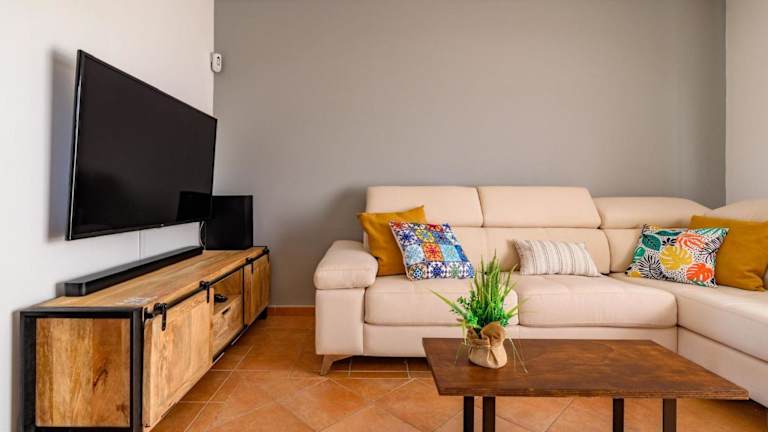 Die Villa umfasst zwei Schlafzimmer, ein Wohnzimmer, zwei Badezimmer mit Bidet und Dusche sowie eine gut ausgestattete Küche. Zur Ausstattung gehören ein Flachbild-Satelliten-TV und Handtücher sowie Bettwäsche. Eine Terrasse bietet einen herrlichen Meerblick.