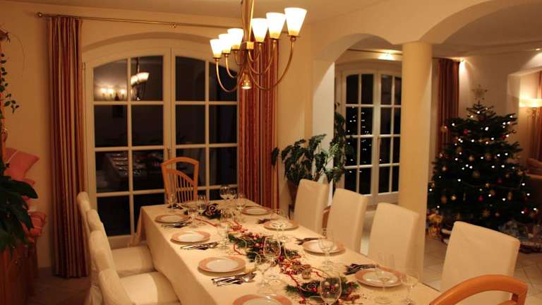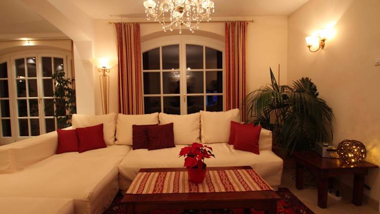 Das Ferienhaus umfasst eine komplett ausgestattete Küche mit Kühlschrank, Geschirrspüler und Ofen. Es verfügt über ein Wohnzimmer mit Sitz- und Essbereich, 6 Schlafzimmer und 3 Badezimmer mit Dusche und Whirlpool. Handtücher und Bettwäsche werden bereitgestellt, zudem ist ein DVD-Player vorhanden.