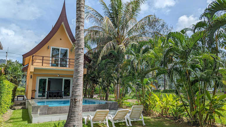 65C Villa with Private Pool - by KohChangVillas bietet Übernachtungsmöglichkeiten mit kostenlosem Wifi, Klimaanlage, einem Aussenpool sowie einem Garten. Die Unterkunft besticht durch Gartenblick und einen Balkon. Die Villa umfasst vier Schlafzimmer und vier Badezimmer sowie eine voll ausgestattete Küche und eine Terrasse mit Seeblick.