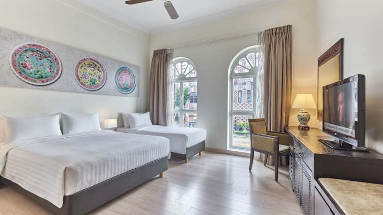 Die klimatisierten Zimmer sind modern und im Peranakan-Stil eingerichtet. Sie bieten Annehmlichkeiten wie einen Safe, Flachbild-TV, Minibar, Tee- und Kaffeezubereiter sowie ein eigenes Bad mit Dusche und Haartrockner. Hausschuhe und Pflegeprodukte stehen den Gästen zur Verfügung. Einige Zimmer sind rollstuhlgerecht und die Unterkunft bietet Familien-, Nichtraucher- und Raucherzimmer