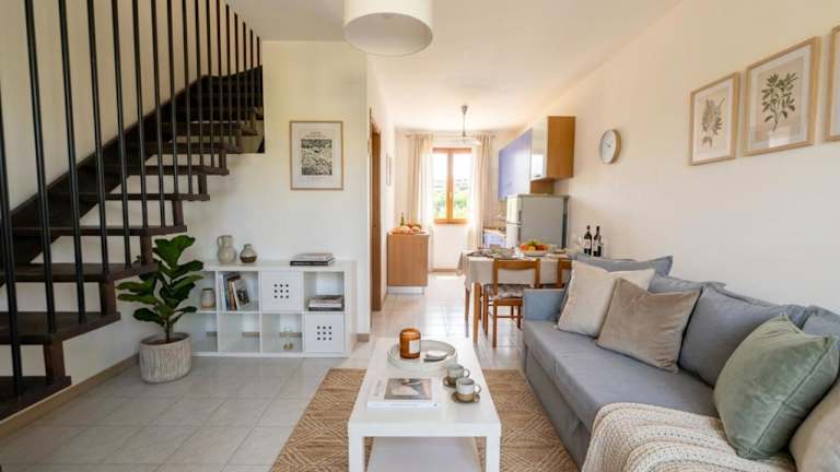 Das Ferienhaus beinhaltet 2 Schlafzimmer, ein Wohnzimmer und eine voll ausgestattete Küche mit Kühlschrank. Es gibt 2 Badezimmer mit Bidet und kostenlosen Pflegeprodukten. Handtücher und Bettwäsche werden bereitgestellt.