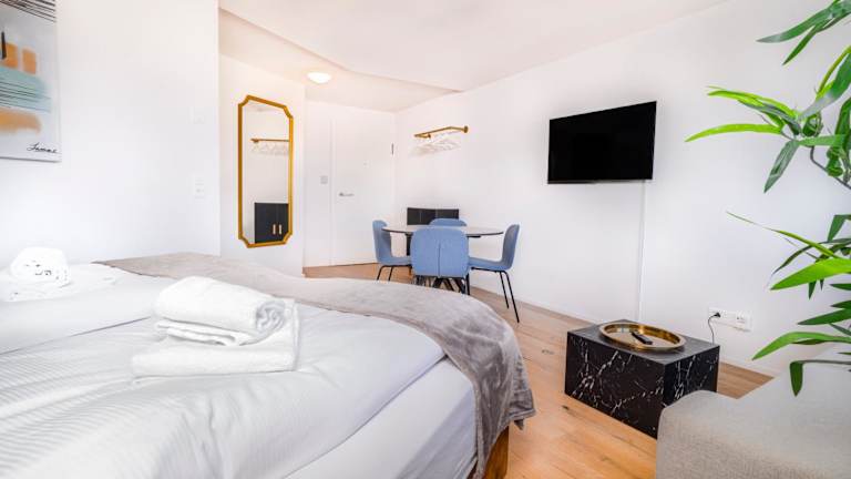Die Apartments sind mit einem Sitzbereich ausgestattet, der ein Schlafsofa umfasst. Zu den Annehmlichkeiten zählen ein Flachbild-Satelliten-TV, ein Blu-ray-Player, eine voll ausgestattete Küche und ein eigenes Badezimmer mit kostenlosen Pflegeprodukten. Die Küche verfügt über einen Kühlschrank, Geschirrspüler, Ofen, Kaffeemaschine und Wasserkocher. Einige Zimmer sind allergikerfreundlich und schallisoliert.