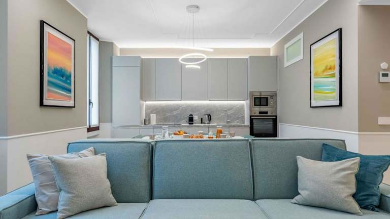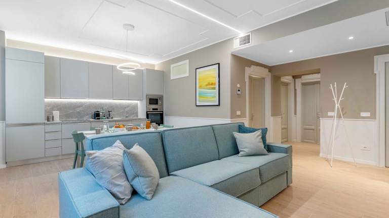 Die Zimmer in Vitruvio Palace - La Vista Apartments sind komfortabel eingerichtet und verfügen über Klimaanlage sowie kostenloses Wifi. Jedes Zimmer bietet einen Balkon, ein gemütliches Sitzbereich und eine moderne Küchenzeile. Darüber hinaus ist ein eigenständiges Badezimmer mit Dusche, Haartrockner und kostenlosen Pflegeprodukten vorhanden. Es gibt auch die Möglichkeit, ein Babybett hinzuzufügen, je nach Verfügbarkeit.