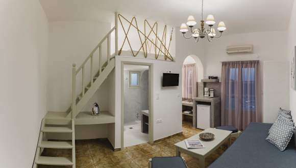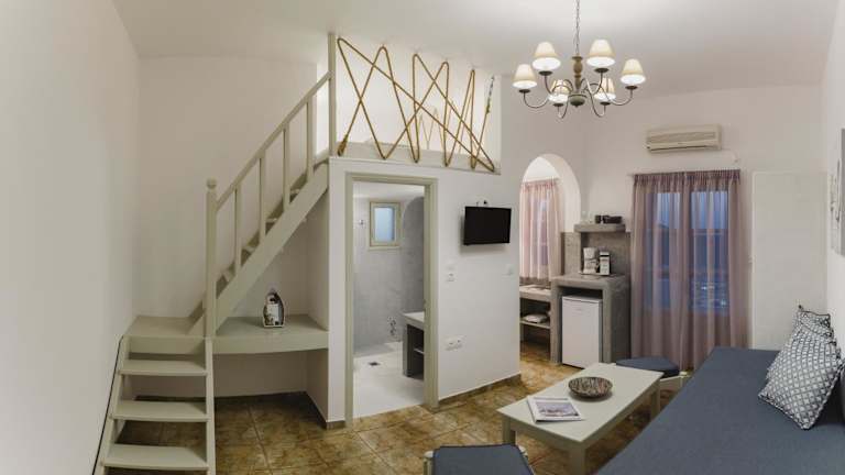 Die Viva Mare Traditional Studios bieten komfortable Unterkünfte zur Selbstverpflegung mit einem traditionellen Charme. Die Studios erstrecken sich über zwei Ebenen und verfügen über ein gemütliches Dachgeschoss sowie einen möblierten Balkon oder eine Terrasse, von denen aus Sie den Blick auf die Ägäis und das Dorf Pera Gyalos genießen können. Jedes Studio ist klimatisiert und verfügt über ein Wohnzimmer mit einem bequemen Sofa und einem Digital-TV. Die offene Küchenzeile ist mit einem Essbereich und einem Mini-Backofen mit Kochfeldern ausgestattet. Eine Espressomaschine und eine Filterkaffeemaschine stehen ebenfalls zur Verfügung. Bei Ihrer Ankunft erhalten Sie ein Begrüßungspaket mit einer Flasche Wein, Wasser, Säften und Frühstücksartikeln. Ein täglicher Reinigungsservice sorgt dafür, dass Ihr Studio immer sauber und ordentlich ist, und ein Bügeleisen und ein Haartrockner stehen für Ihren Gebrauch bereit.