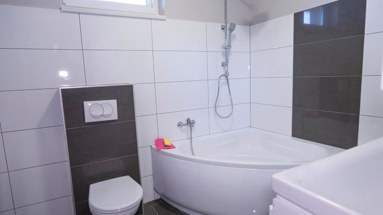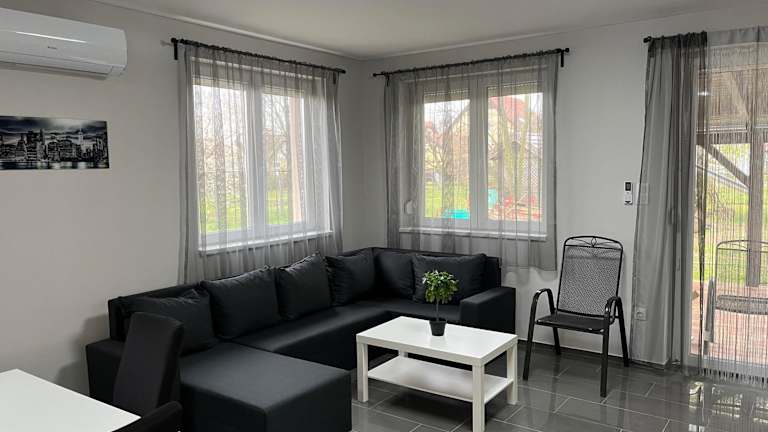 Das klimatisierte Apartment im Vivien vendégház 2 verfügt über zwei Schlafzimmer, ein Wohnzimmer und eine voll ausgestattete Küche mit Kühlschrank und Kaffeemaschine. Das Apartment bietet zudem ein Badezimmer mit Badewanne. Handtücher und Bettwäsche werden gestellt, um Ihnen einen angenehmen Aufenthalt zu ermöglichen.