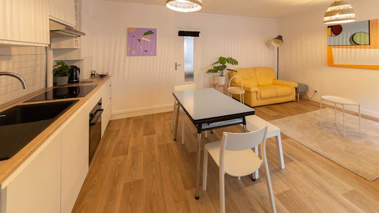 Die Ferienwohnung umfasst 2 Schlafzimmer, ein Wohnzimmer und eine voll ausgestattete Küche, die mit einem Kühlschrank und einer Kaffeemaschine eingerichtet ist. Zur Ausstattung gehört auch ein Badezimmer mit einer Badewanne und einem Haartrockner. Handtücher und Bettwäsche werden bereitgestellt.