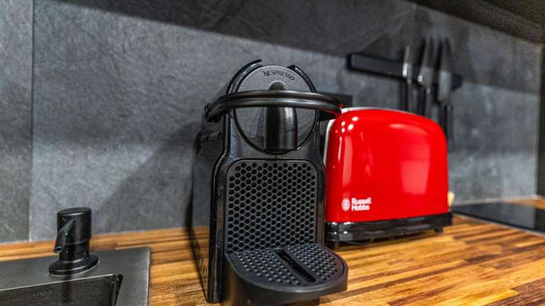Die Ferienwohnung verfügt über eine Küche, die mit einem Kühlschrank, Geschirrspüler, einer Mikrowelle, einer Kaffeemaschine sowie einem Wasserkocher ausgestattet ist.