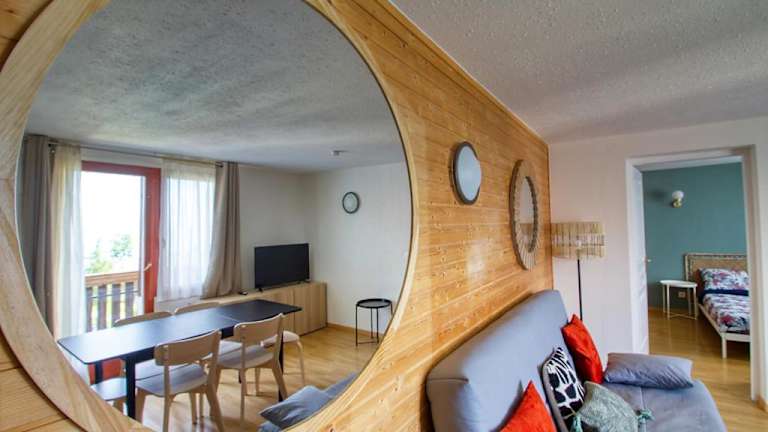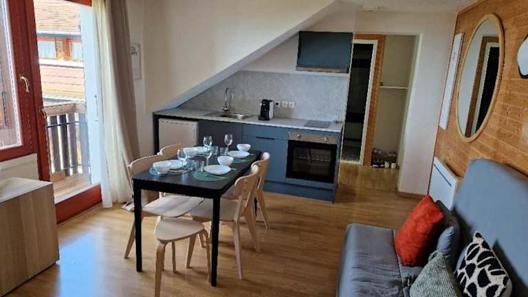 Die Ferienwohnung bietet einen Balkon mit Bergblick und beinhaltet zwei Schlafzimmer, ein Wohnzimmer sowie ein Badezimmer mit Badewanne. Die gut ausgestattete Küche verfügt über einen Kühlschrank und einen Ofen. Zur Ausstattung gehören auch Handtücher und Bettwäsche.