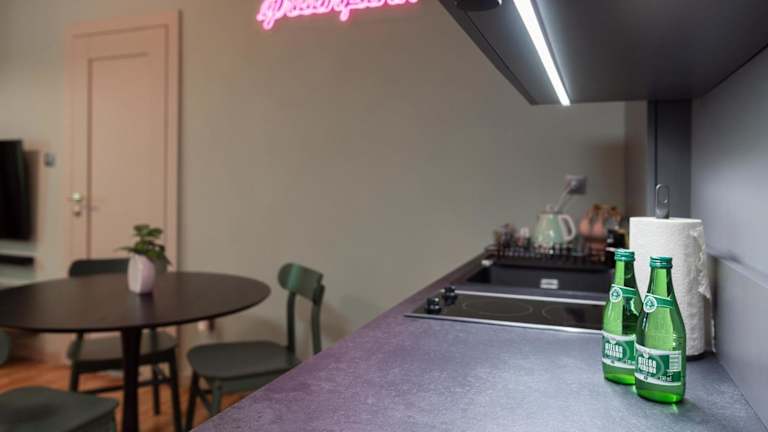 Die Ferienwohnung besteht aus einem Schlafzimmer, einem Wohnzimmer und einer voll ausgestatteten Küche mit Kühlschrank und Wasserkocher. Ein Badezimmer mit Dusche und kostenlosen Pflegeprodukten ist ebenfalls vorhanden. Handtücher und Bettwäsche werden bereitgestellt.