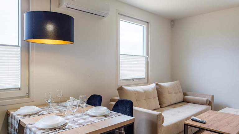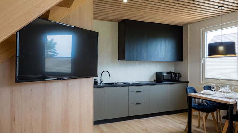 Die klimatisierten Wohneinheiten im Wakacyjna Osada sind komfortabel und modern eingerichtet. Jede Einheit verfügt über eine Terrasse, auf der Sie die frische Luft und die ruhige Umgebung genießen können. Zur Ausstattung gehören auch ein Flachbild-TV und ein eigenes Badezimmer mit Dusche und Haartrockner. Die Küchenzeile bietet alle Annehmlichkeiten, die Sie für die Zubereitung Ihrer eigenen Mahlzeiten benötigen, einschließlich Kühlschrank, Mikrowelle, Kochfeld und Wasserkocher.
