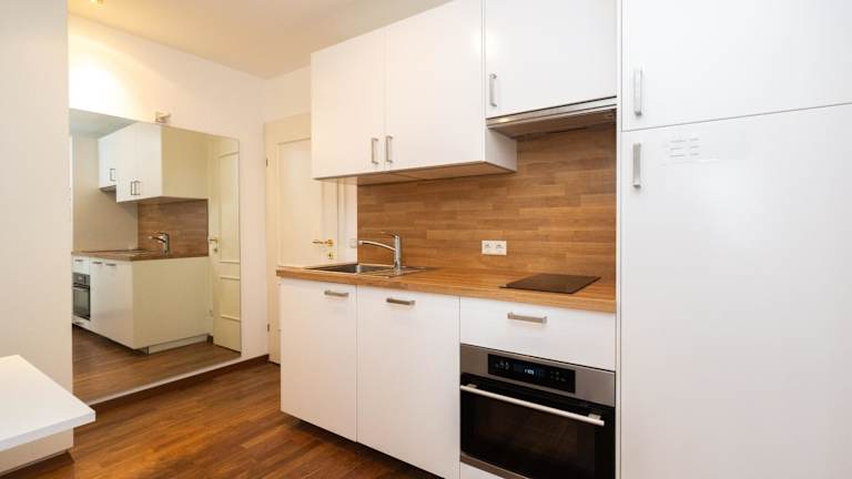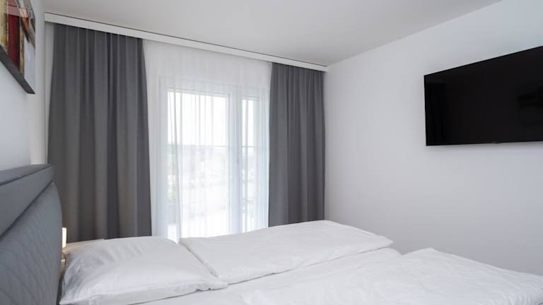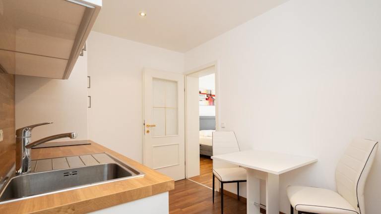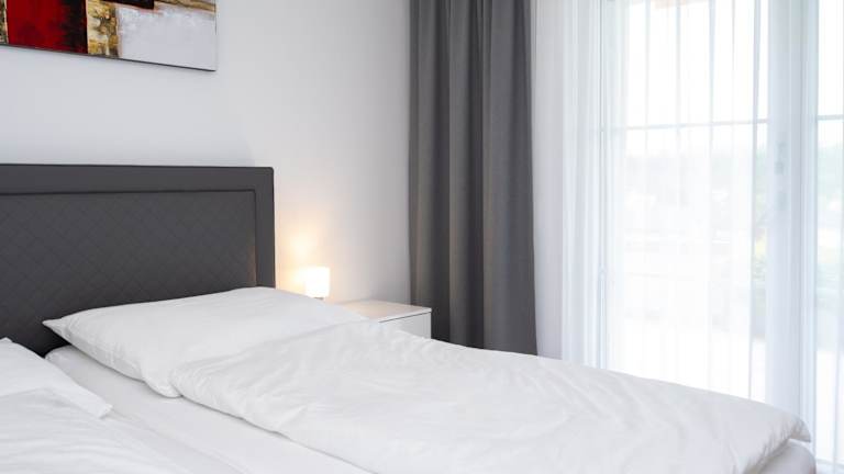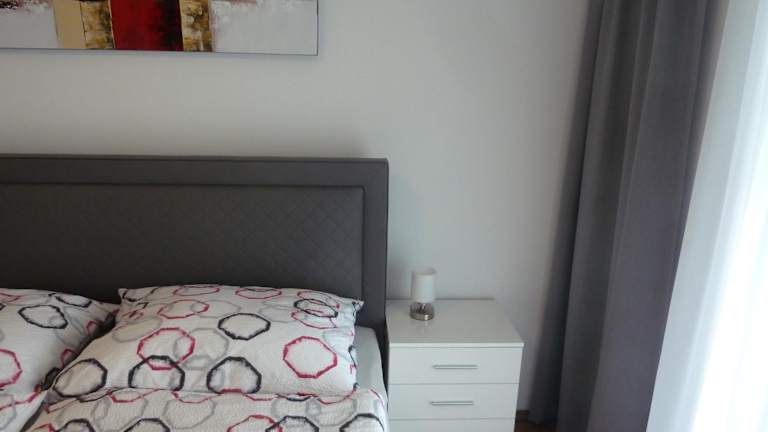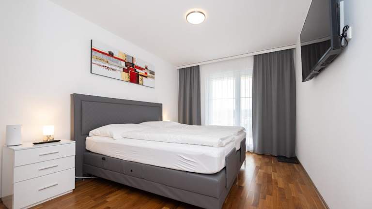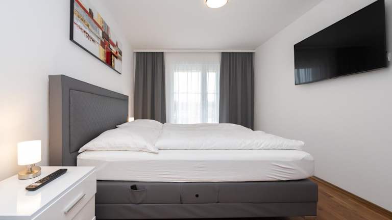 Die Ferienwohnung verfügt über ein Schlafzimmer und eine gut ausgestattete Küche mit Geschirrspüler und Ofen. Ein Flachbild-TV, ein Sitzbereich sowie ein Badezimmer mit Dusche sind ebenfalls vorhanden. Handtücher und Bettwäsche werden bereitgestellt.