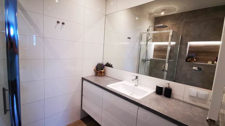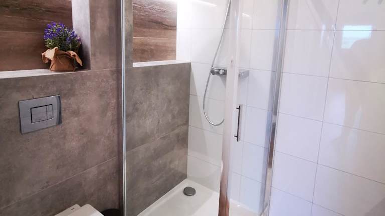 Die Ferienwohnung bietet eine gut ausgestattete Küchenzeile mit Kühlschrank und Geschirrspüler, sowie 1 Badezimmer mit Dusche. Handtücher und Bettwäsche sind vorhanden.