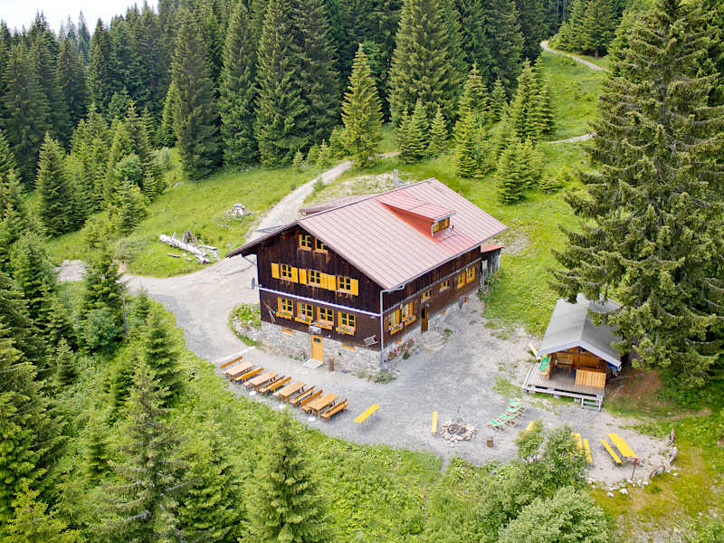 Die Hütte befindet sich auf 1.350m Höhe in Alleinlage, nur 9 km von Oberstdorf und 3,5 km vom Bahnhof in Fischen im Allgäu entfernt.