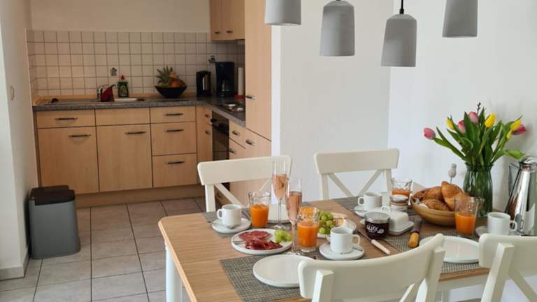 Die Ferienwohnung umfasst 2 Schlafzimmer, ein Wohnzimmer mit Flachbild-TV, eine gut ausgestattete Küche mit Kühlschrank und Ofen sowie ein Badezimmer mit Dusche. Eine Terrasse mit Gartenblick lädt zum Verweilen ein. Handtücher und Bettwäsche werden zur Verfügung gestellt.