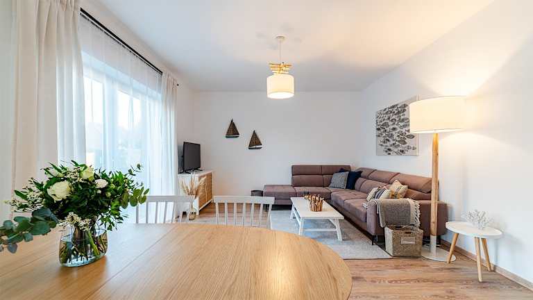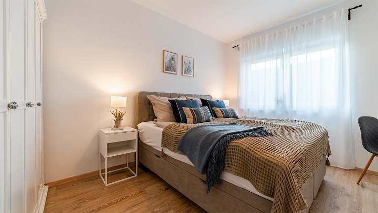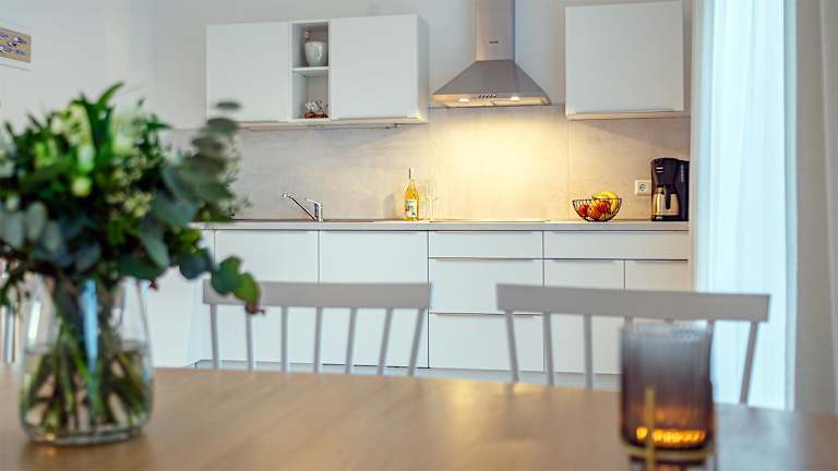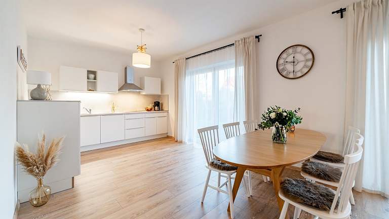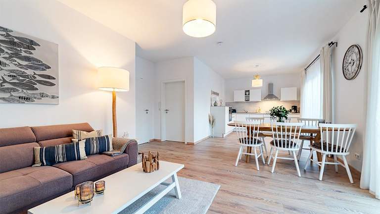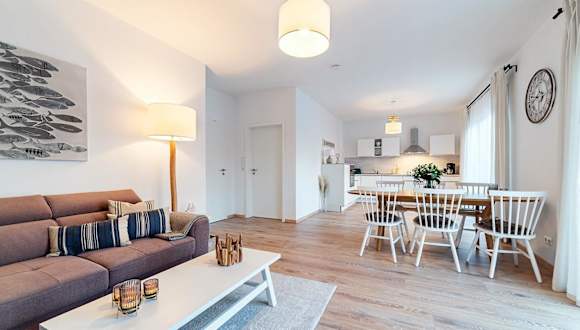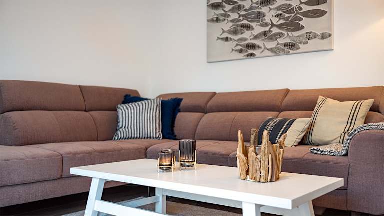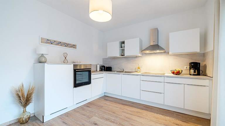 Die Ferienwohnung verfügt über 2 Schlafzimmer, eine gut ausgestattete Küche mit Kühlschrank und Geschirrspüler sowie ein Wohnzimmer mit TV.