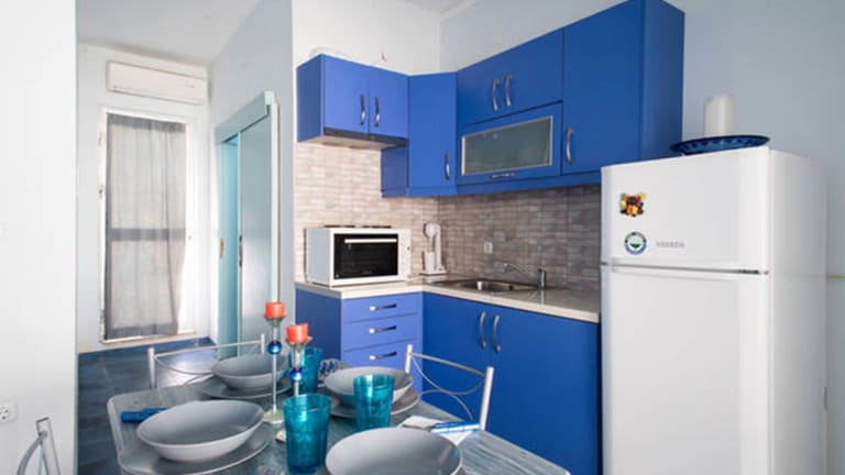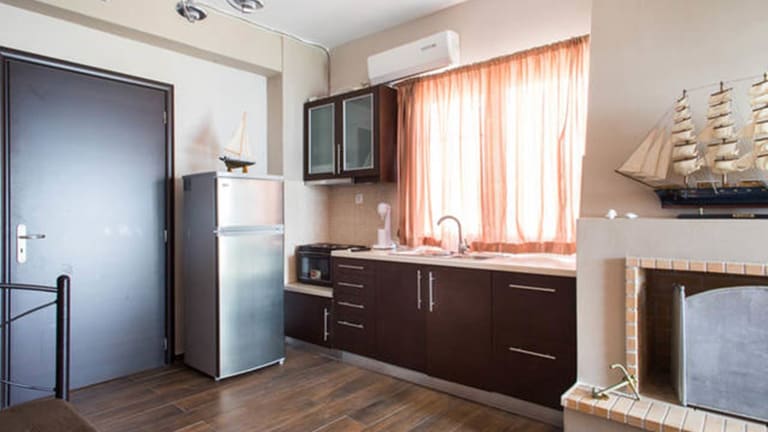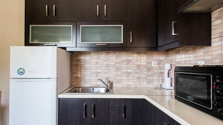 Es gibt eine voll ausgestattete Küche in jeder Wohneinheit, die unter anderem einen Kühlschrank, eine Herdplatte, eine Kaffeemaschine und einen Wasserkocher umfasst.
