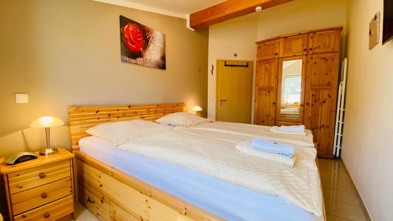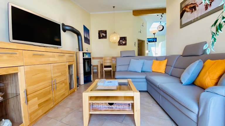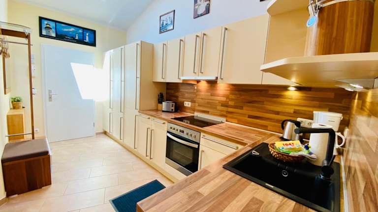 Die Ferienwohnung umfasst 1 Schlafzimmer, ein Wohnzimmer mit Flachbild-TV, eine gut ausgestattete Küchenzeile mit Kühlschrank und Geschirrspüler sowie ein Badezimmer mit Dusche. Ein Balkon mit Meerblick ist ebenfalls vorhanden. Handtücher und Bettwäsche werden bereitgestellt.