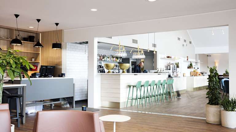 Das Frühstücksbuffet im Welcome Hotel Barkarby bietet eine Auswahl an warmen und kalten Speisen. Im hauseigenen À-la-carte-Restaurant werden schwedische und internationale Gerichte serviert. Snacks sind an verschiedenen Stationen verfügbar, darunter ein Getränkeautomaten und ein Snackautomat.