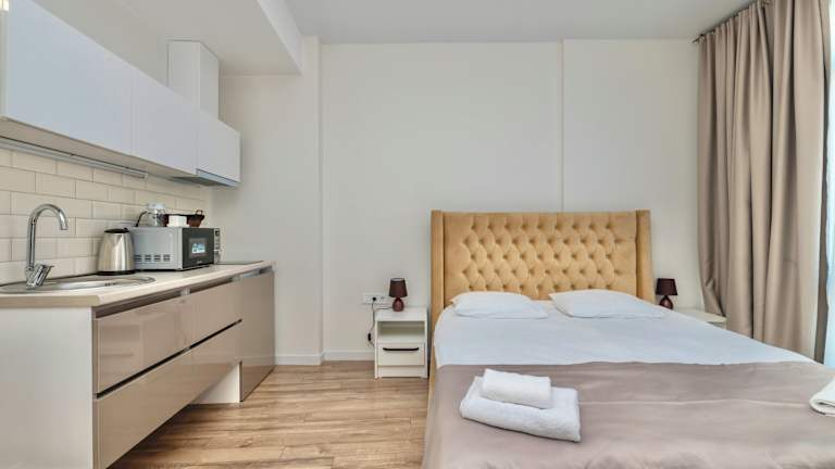 Die Zimmer im White Sails Residential Hotel sind modern eingerichtet und bieten einen Balkon mit Stadtblick. Jedes Zimmer verfügt über einen Sitzbereich, einen Kabel-Flachbild-TV sowie eine voll ausgestattete Küche mit einem Kühlschrank, einer Mikrowelle und einer Herdplatte. Ein eigenes Badezimmer mit Dusche und kostenlosen Pflegeprodukten gehört ebenfalls zur Ausstattung. Zusätzliche Annehmlichkeiten umfassen einen Wasserkocher und die Möglichkeit, Zustellbetten zu arrangieren.