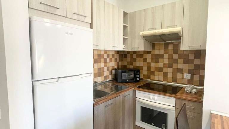 Die Ferienwohnung umfasst ein Schlafzimmer, ein Wohnzimmer sowie eine gut ausgestattete Küche, die mit einem Kühlschrank und einem Ofen ausgestattet ist. Zudem bietet sie eine Terrasse und wird mit Handtüchern sowie Bettwäsche ausgestattet.