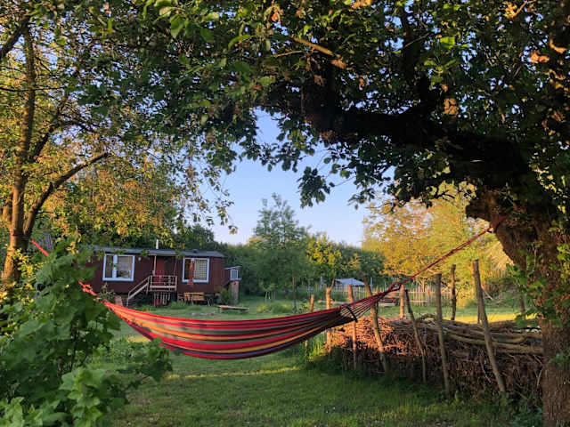 Wilde Möhre Bauwagen Sommerküche Draussen Abenteuer bietet eine einzigartige Übernachtungsmöglichkeit in einem Ferienhaus mit Garten und Terrasse. Die Lage ermöglicht einen Blick ins Grüne und es stehen kostenloses WLAN sowie verschiedene Freizeitmöglichkeiten zur Verfügung.