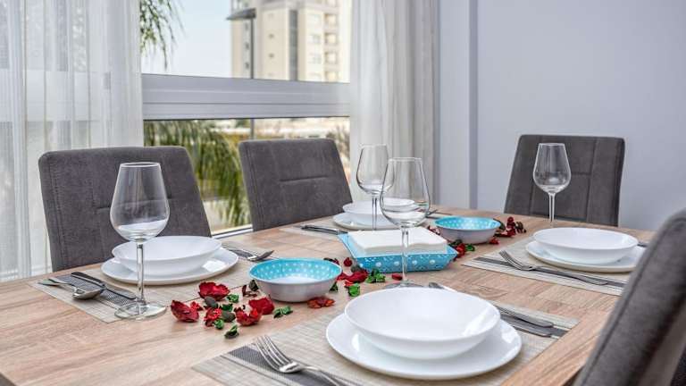 In der voll ausgestatteten Küche der Ferienwohnung stehen ein Kühlschrank und eine Kaffeemaschine zur Verfügung. Essenslieferung in die Unterkunft ist möglich.