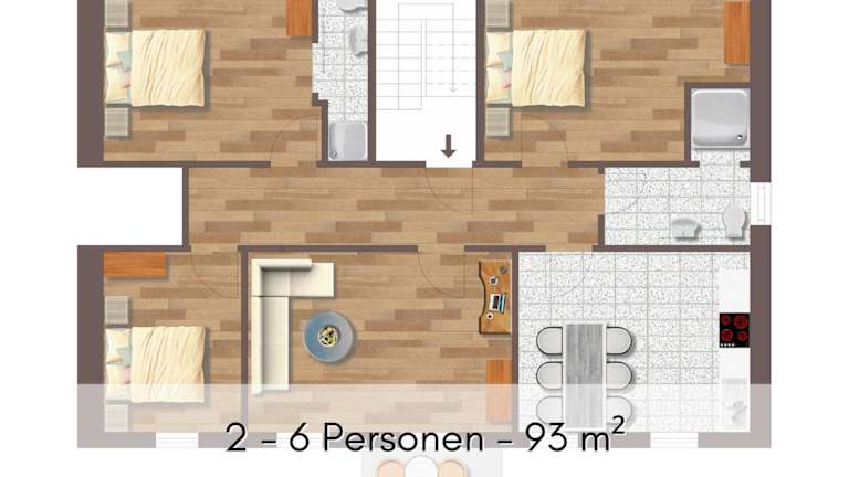 Die Ferienwohnung umfasst 3 Schlafzimmer sowie ein Wohnzimmer. Die Ausstattung beinhaltet einen Flachbild-TV, eine gut ausgestattete Küche mit Kühlschrank und Geschirrspüler sowie 2 Badezimmer mit Dusche. Handtücher und Bettwäsche sind in der Unterkunft ebenfalls verfügbar.