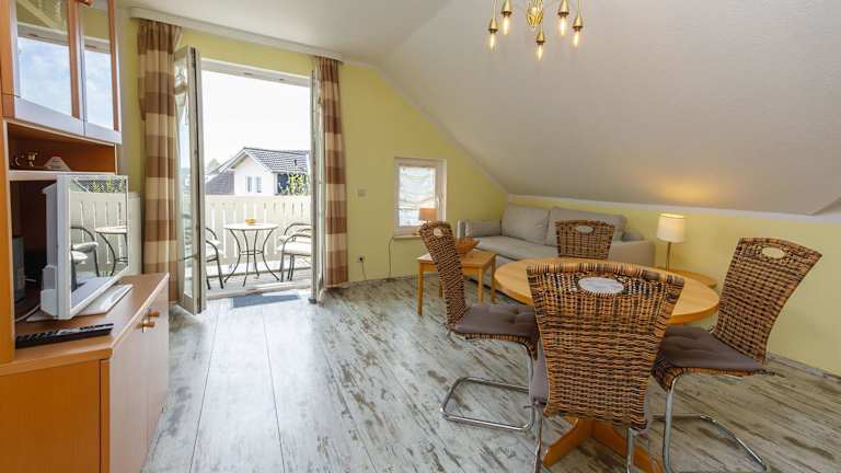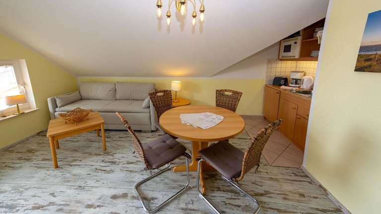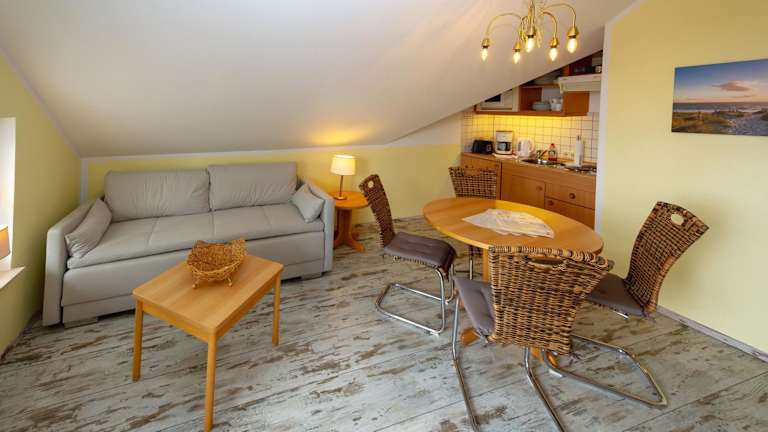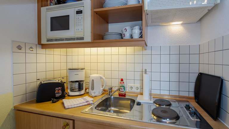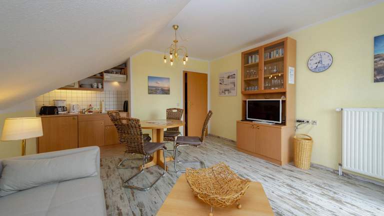 Die Ferienwohnung umfasst ein Schlafzimmer, ein Wohnzimmer mit einem TV sowie eine voll ausgestattete Küchenzeile mit Kühlschrank und Geschirrspüler. Sie verfügt über ein Badezimmer mit Dusche und ist ideal für einen gemütlichen Aufenthalt. Die Ausstattung ist darauf ausgelegt, den Gästen Bequemlichkeit während ihres Aufenthalts zu bieten.