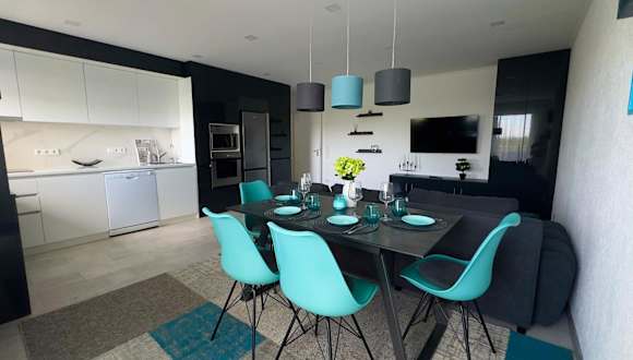Die Ferienwohnung verfügt über eine voll ausgestattete Küche mit Kühlschrank und Kaffeemaschine, was eine eigenständige Verpflegung ermöglicht. Keine Informationen zu weiteren Verpflegungsmöglichkeiten.