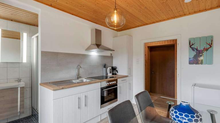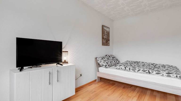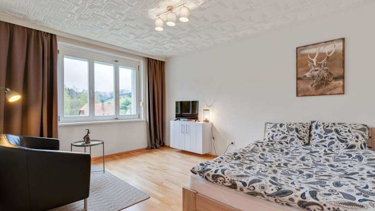 Die Ferienwohnung umfasst ein Schlafzimmer, einen TV, eine gut ausgestattete Küche mit Kühlschrank und Ofen sowie vier Badezimmer mit Dusche. Handtücher und Bettwäsche werden zur Verfügung gestellt.