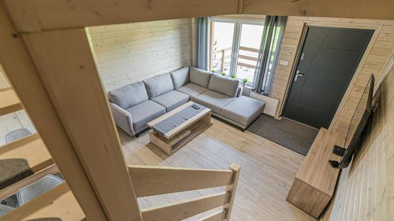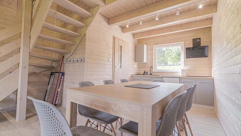 Die Ferienhäuser bestehen aus zwei Schlafzimmern, einem Wohnzimmer sowie einer voll ausgestatteten Küche mit Kühlschrank und Wasserkocher. Es gibt ein Badezimmer mit Dusche und Haartrockner. Handtücher und Bettwäsche werden zur Verfügung gestellt. Zur Ausstattung gehören auch eine Terrasse und ein Kinderspielplatz.