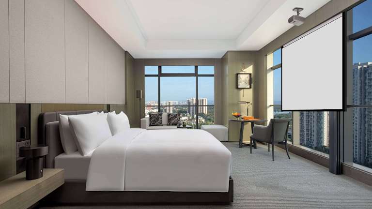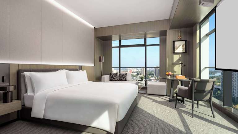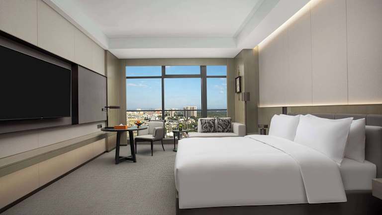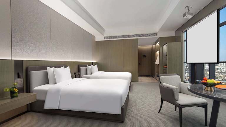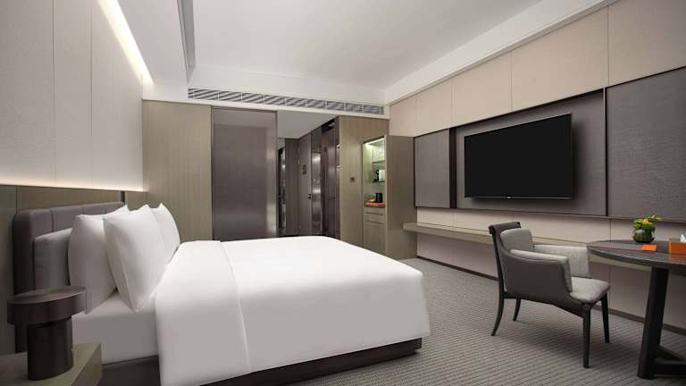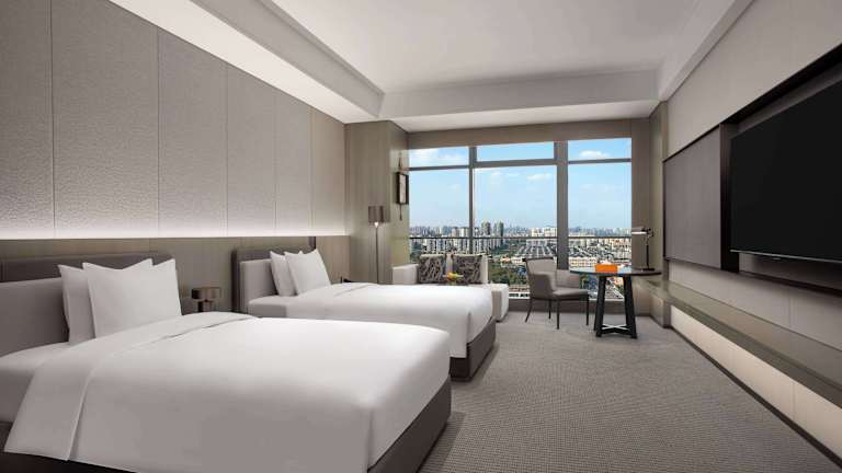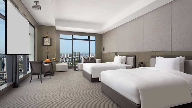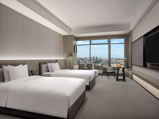 Die Zimmer im Wyndham Grand Chengdu East sind mit Klimaanlage, einem Sitzbereich, einem Flachbild-TV mit Satellitenkanälen, einem Safe und einem eigenen Badezimmer ausgestattet. Jedes Zimmer verfügt über eine Dusche, kostenfreie Pflegeprodukte, Hausschuhe sowie einen Wasserkocher. Einige Wohneinheiten bieten zudem einen Seeblick. Alle Zimmer sind mit Bettwäsche und Handtüchern ausgestattet.