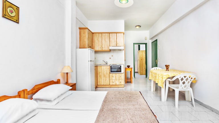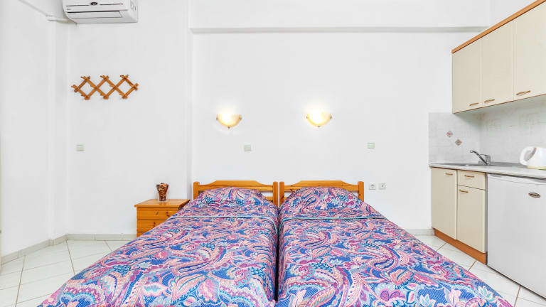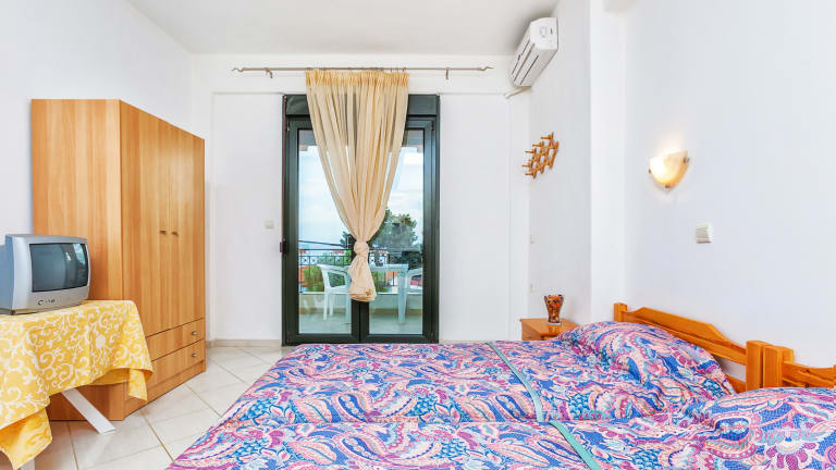Doppelstudios sind mit 2 zusammengeschobenen Einzelbetten oder einem Doppelbett ausgestattet. Dreifachstudios sind mit 2 zusammengeschobenen Einzelbetten oder 1 Doppelbett und einem Einzelbett für eine dritte Person ausgestattet. Familienapartments sind eine ideale Wahl für Familien oder eine Gruppe von Freunden. Sie bestehen aus zwei Schlafzimmern mit jeweils 2 Standard-Einzelbetten oder 1 Doppelbett ohne Verbindungstür. Alle Zimmer verfügen über: Voll ausgestattete Küchenzeile Kühlschrank Satellitenfernsehen Individuelle Klimaanlage Balkon mit Meer- oder Bergblick