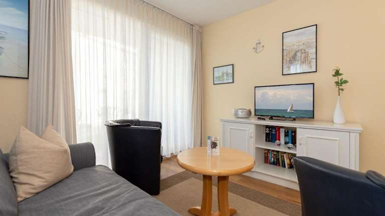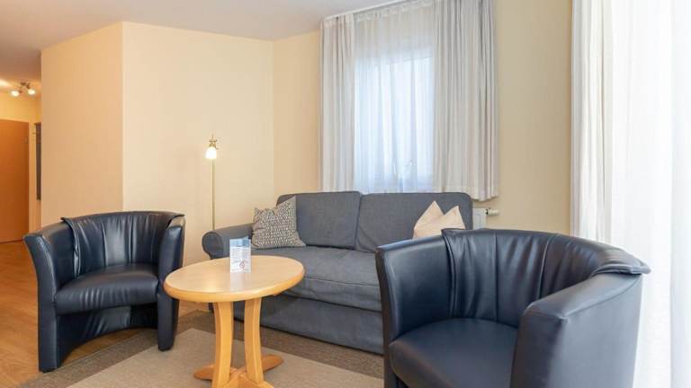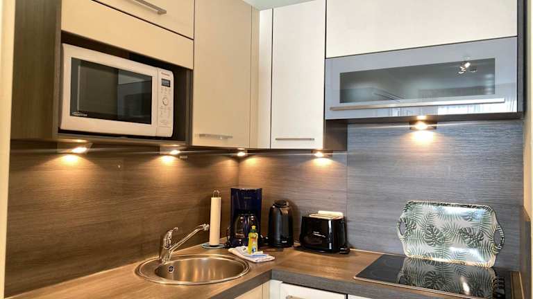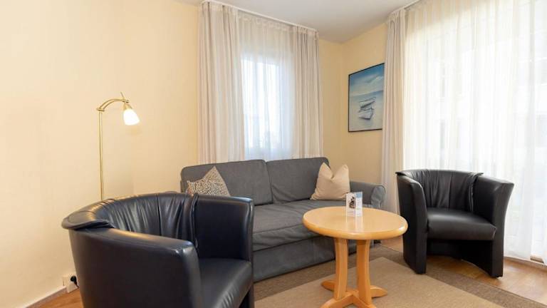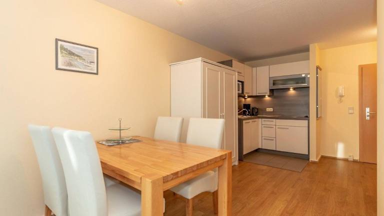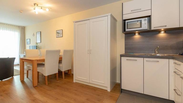 Die Ferienwohnung umfasst ein Schlafzimmer, ein Wohnzimmer sowie eine gut ausgestattete Küchenzeile mit Kühlschrank und Geschirrspüler. Handtücher und Bettwäsche werden zur Verfügung gestellt. Nichtraucherzimmer gewährleisten eine angenehme Atmosphäre.
