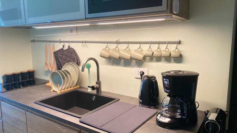 Die Ferienwohnung ist ausgestattet mit einer Veranda/Patiо, einer Kaffeemaschine, einem Flachbild-TV, einem Kühlschrank, einem Geschirrspüler, einer Mikrowelle sowie einem Bidet. Kostenlos Pflegeprodukte und ein Haartrockner sind ebenfalls vorhanden.