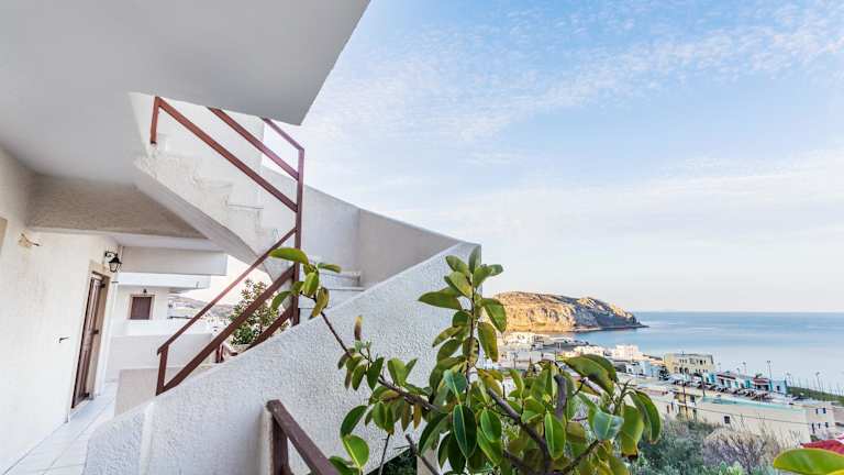 Die Wohneinheiten verfügen über einen Balkon mit Meerblick, eine Küchenzeile mit Kühlschrank und Herdplatte sowie ein eigenes Badezimmer mit Dusche. Die Zimmer sind mit Klimaanlage ausgestattet und bieten Möglichkeiten zur Unterbringung von Zustellbetten.