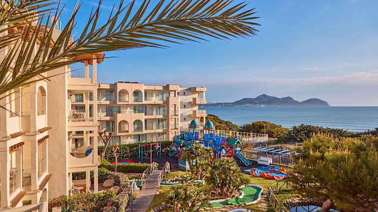 Das Hotel Zafiro Bahía verfügt über 289 Studios und Apartments. Jedes einzelne ist mit einer eigenen Küche ausgestattet, damit Sie ihre Ferien absolut flexibel gestalten können: von einer Unterkunft mit Selbstversorgung bis hin zum All-Inclusive-Paket. Sie passen Ihren Aufenthalt Ihren Bedürfnissen und denen Ihrer Familie an. Zwischen April und Oktober können Sie das durchgehende Unterhaltungs-Programm wahrnehmen, mit Shows und Spielen für alle Altersgruppen und mit einem Spielplatz, Wettbewerben, einem Mini-Club, Videospielen, Filmen, Tanz und einer Hüpfburg für die kleinen Gäste. Auf dem Hotelgelände können Sie auch vielen Sportarten wie Volleyball, Fünferfußball, Bogenschießen oder Padel-Tennis nachgehen. Gönnen Sie sich danach Ruhe und Entspannung zum Beispiel am Oasis-Pool mit Entspannungsbereich (nur für Erwachsene) oder genießen Sie einen erfrischenden Cocktail an der Strandbar Mirablau, während sich die Kids im Kinderpool mit seinem Piratenschiff austoben.