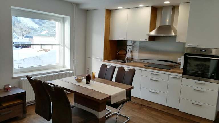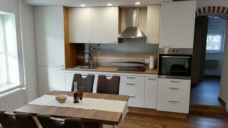 Die Ferienwohnung verfügt über ein Schlafzimmer, ein Wohnzimmer und eine voll ausgestattete Küche mit Kühlschrank und Kaffeemaschine. Es gibt ein Badezimmer mit Badewanne oder Dusche sowie einen Haartrockner. Handtücher und Bettwäsche werden zur Verfügung gestellt.