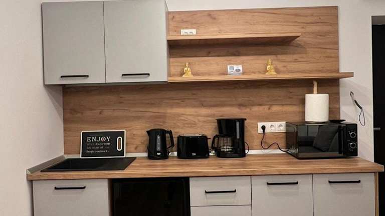 Jede Wohneinheit beinhaltet eine gut ausgestattete Küchenzeile mit Kühlschrank, Mikrowelle, Toaster und Wasserkocher, die Gästen die Möglichkeit zur Selbstverpflegung bietet.